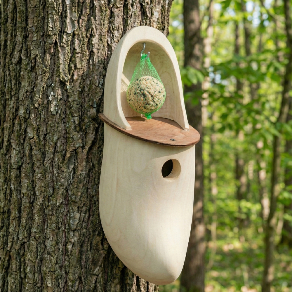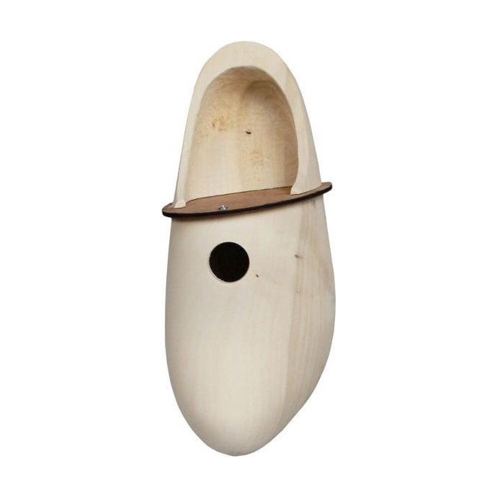 Niet zomaar een vogelhuis, maar één in de vorm van een klomp. Typisch Hollands, robuust en precies zoals het hoort. Gemaakt van onbewerkt hout, zonder lak of fratsen.