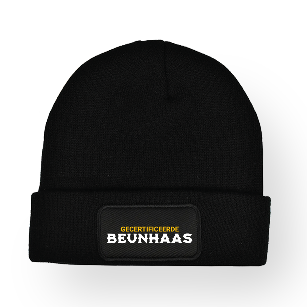 Niet alles hoeft volgens het boekje te gaan. Soms werkt een tie-wrap, een rol duct-tape en een goed idee net zo goed. Deze warme muts met de opdruk GECERTIFICEERDE BEUNHAAS is voor mensen die niet bang zijn om het op hun eigen manier te doen. Ideaal tijdens het klussen, sleutelen of gewoon als statement dat jij het wel regelt.